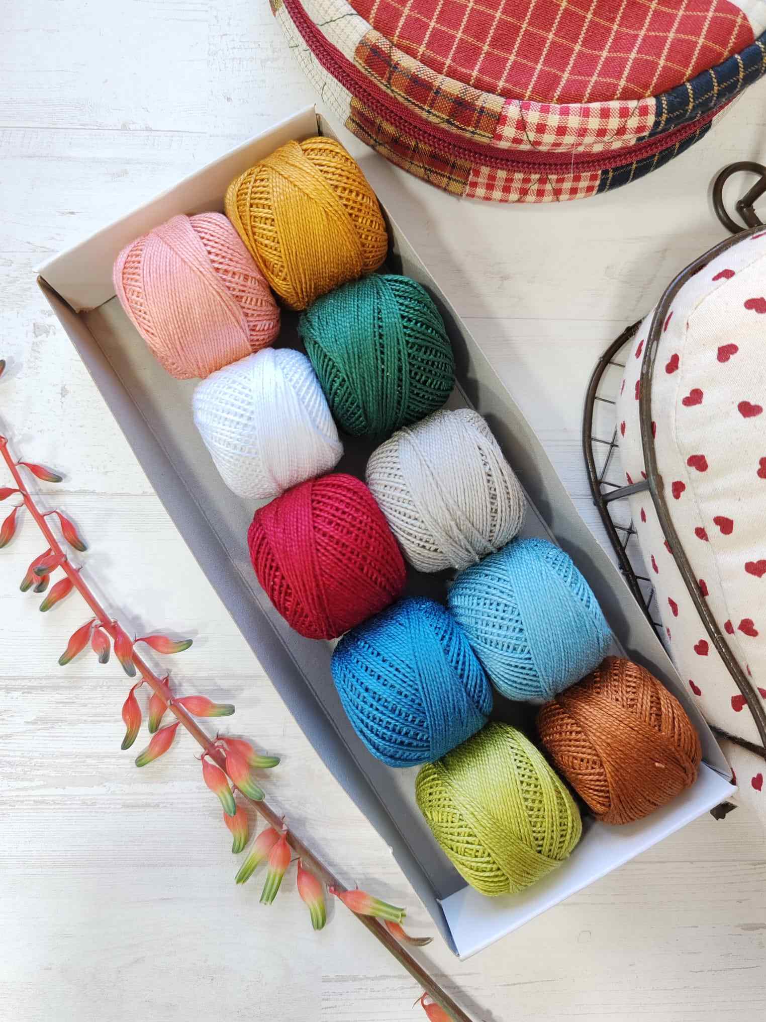 La caja contiene nuestra selección de colores favoritos para bordar sashiko, boro, y otros tipos de bordados.