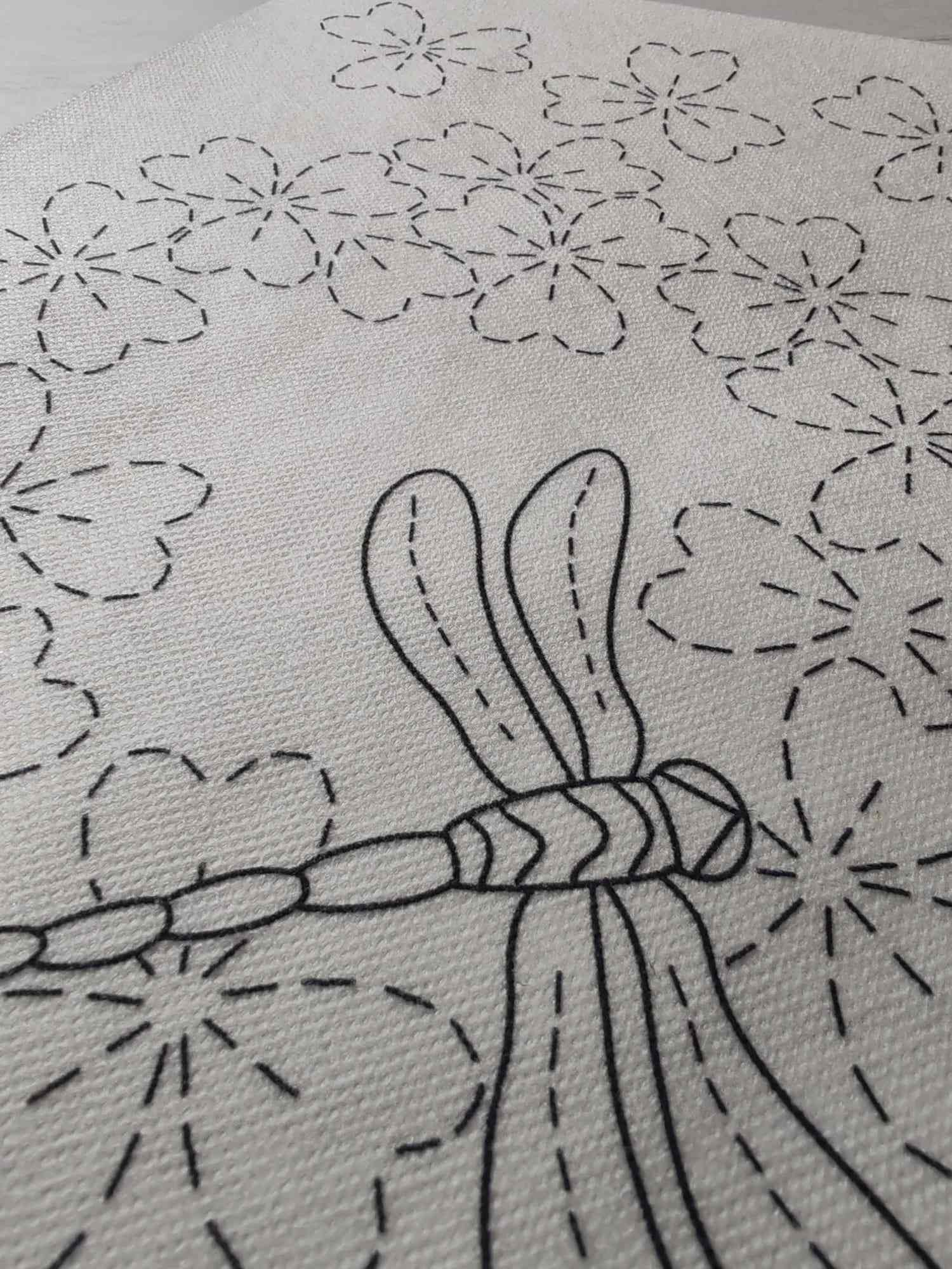 Corona de flores con libélula impresa en fliselina soluble al agua, para bordar sobre camisetas, bolsos o donde se te ocurra.