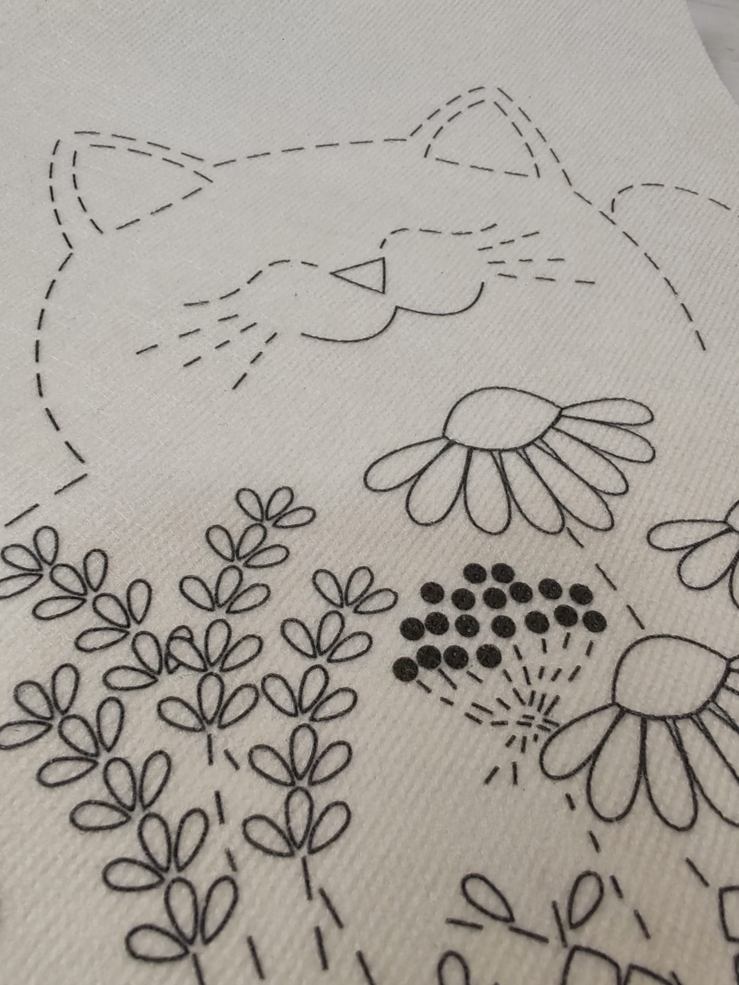 Gato manekinero impreso en fliselina soluble al agua, para bordar sobre camisetas, bolsos o donde se te ocurra.