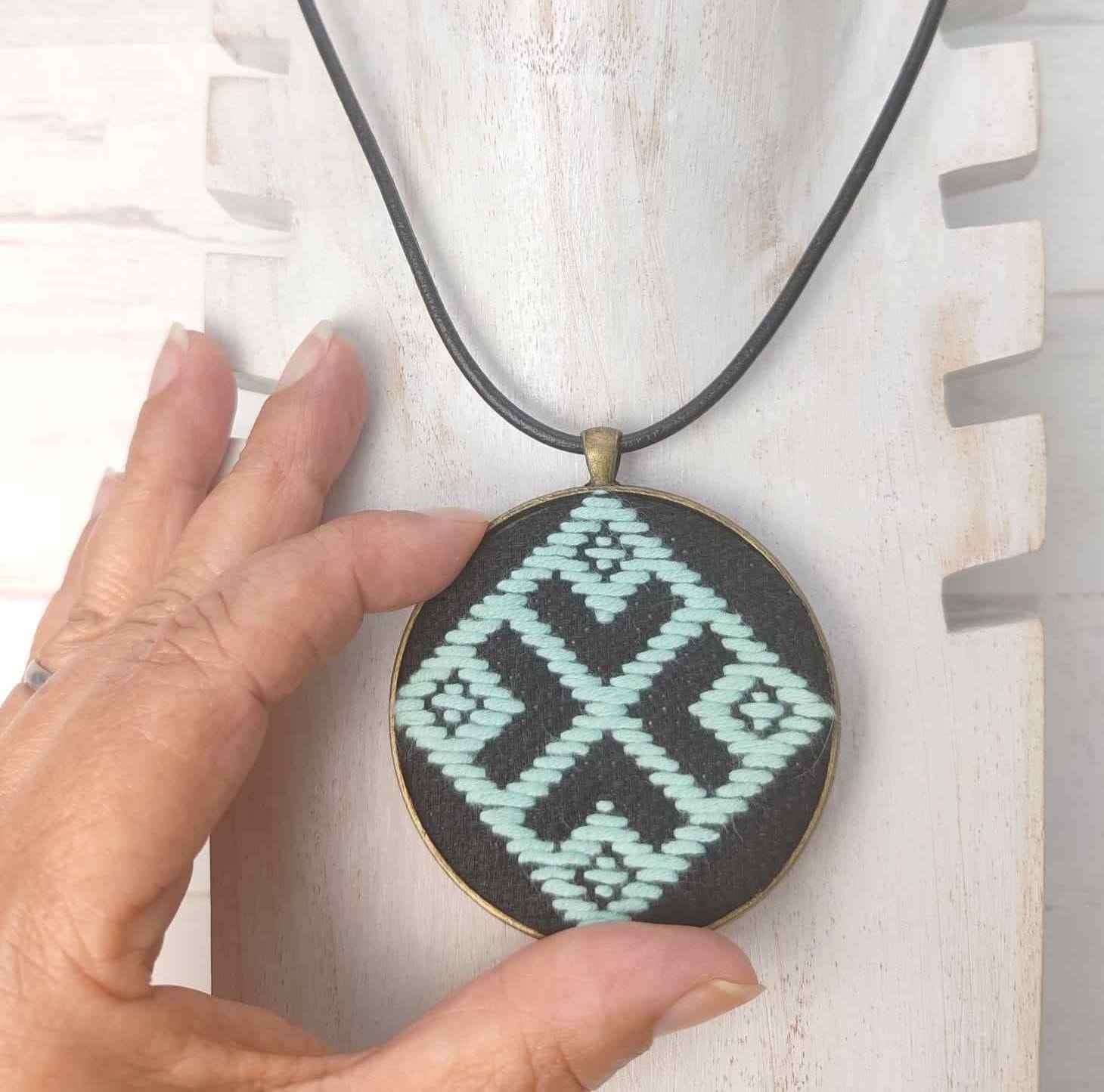 Este kit de costura contine el material para hacer un collar metálico con bordado de sashiko tipo kogin.