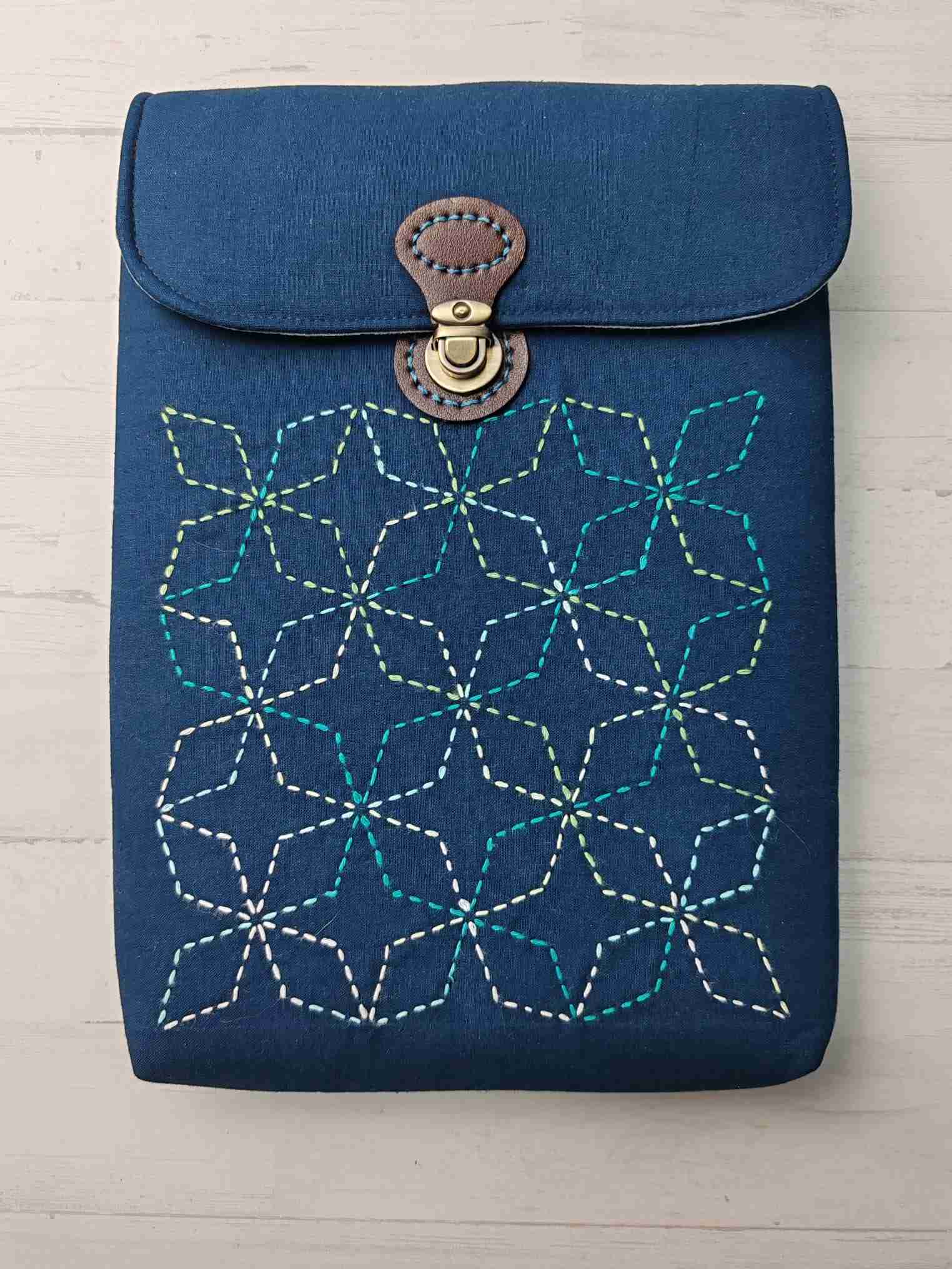 Este completo kit de sashiko contiene las instrucciones , los patrones a tamaño real, las telas, y el cierre para que puedas coser una funda para tu ipad, tu tablet o tu libro.