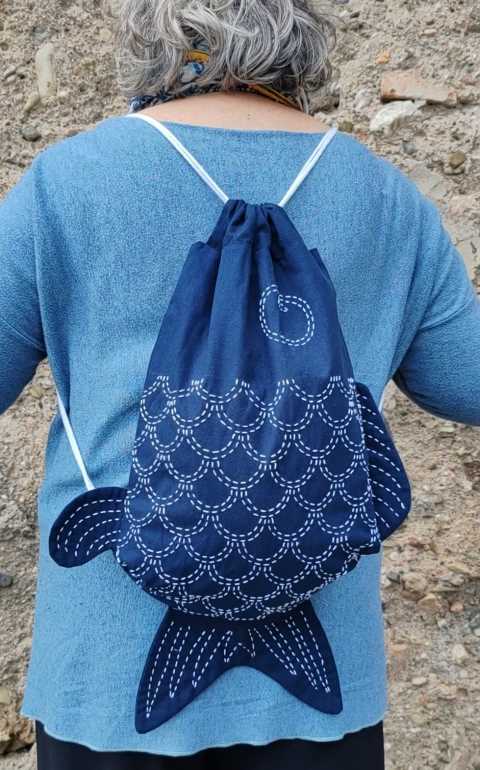 Este completo kit de sashiko contiene las instrucciones , los patrones a tamaño real, las telas, para que puedas coser tu mochila de pez koi de sashiko.