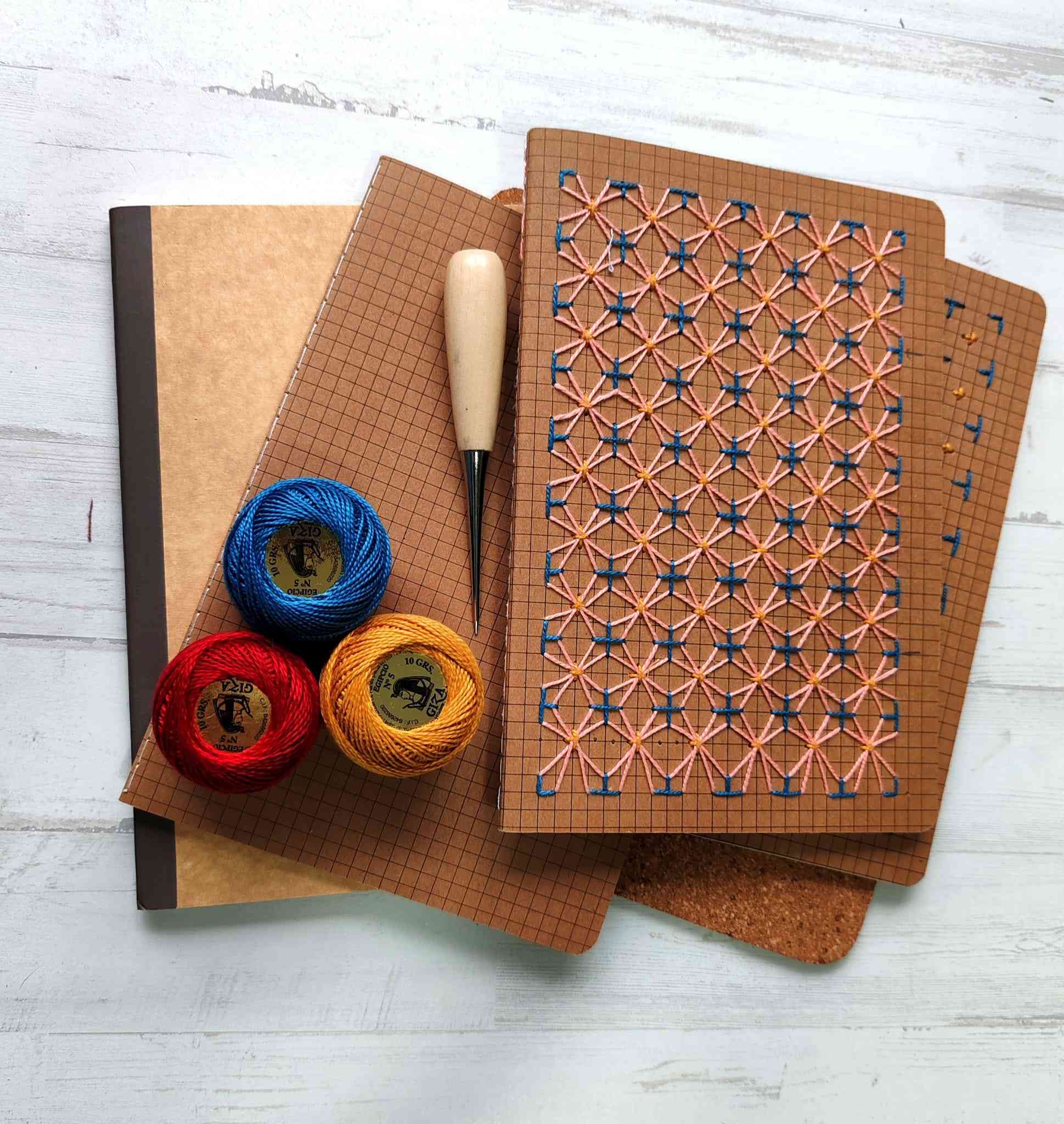 Este kit te guiará paso a paso para crear tu propia libreta bordada con un patrón geométrico tradicional (estilo Moyozashi o Hitomezashi).